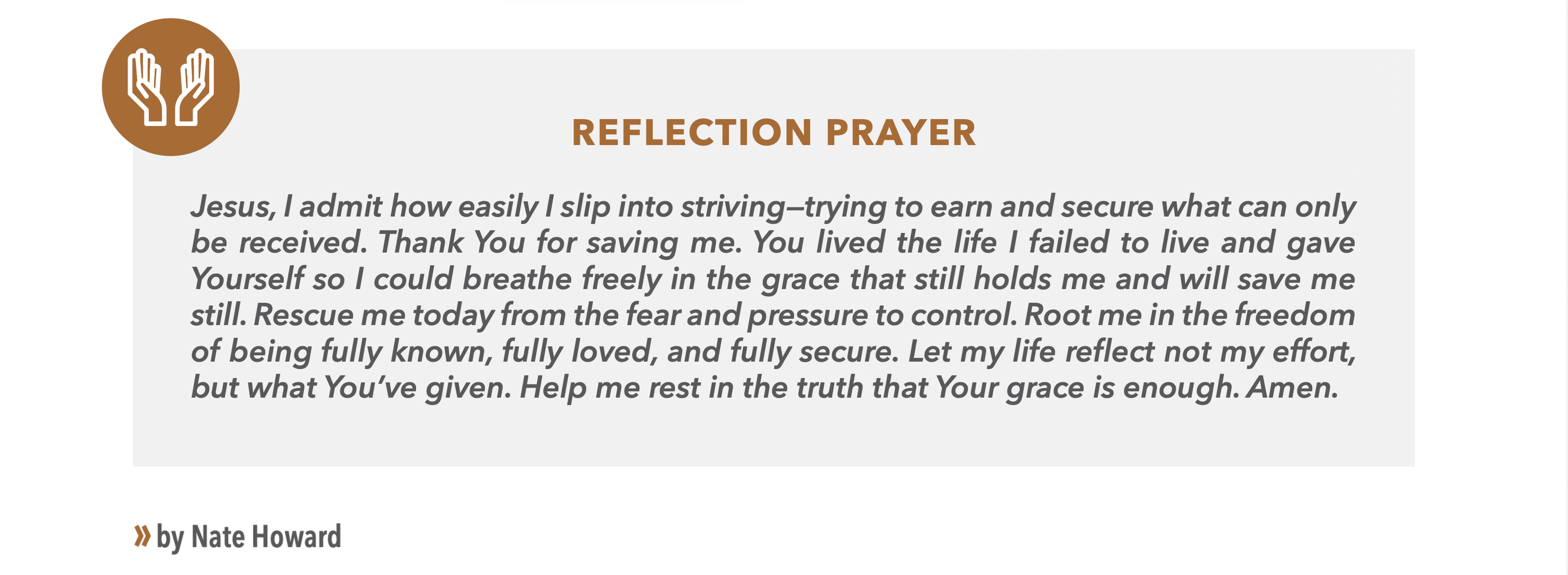That is really good news. We live in a world starving for salvation, a world that constantly tells us we have to earn our worth and protect our own vulnerability. We breathe an atmosphere of pressure—to [possess], perform, [provide], prove, and [self-]protect. In that suffocating air, saving grace is like oxygen. It relieves the ache to make a name for ourselves and the fear that we’re on our own to survive. Grace says: you’re already loved, already secure—not because you earned it, but because Christ gave it.